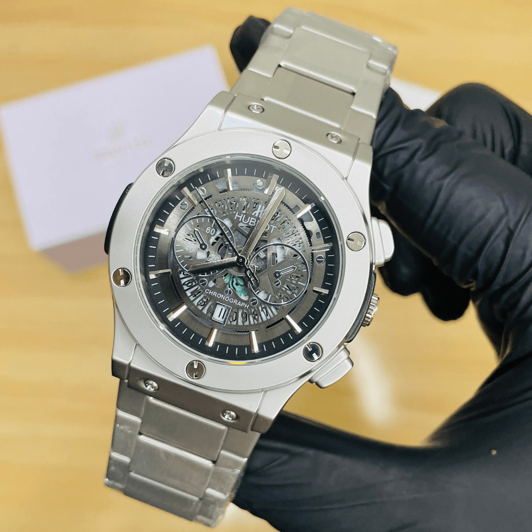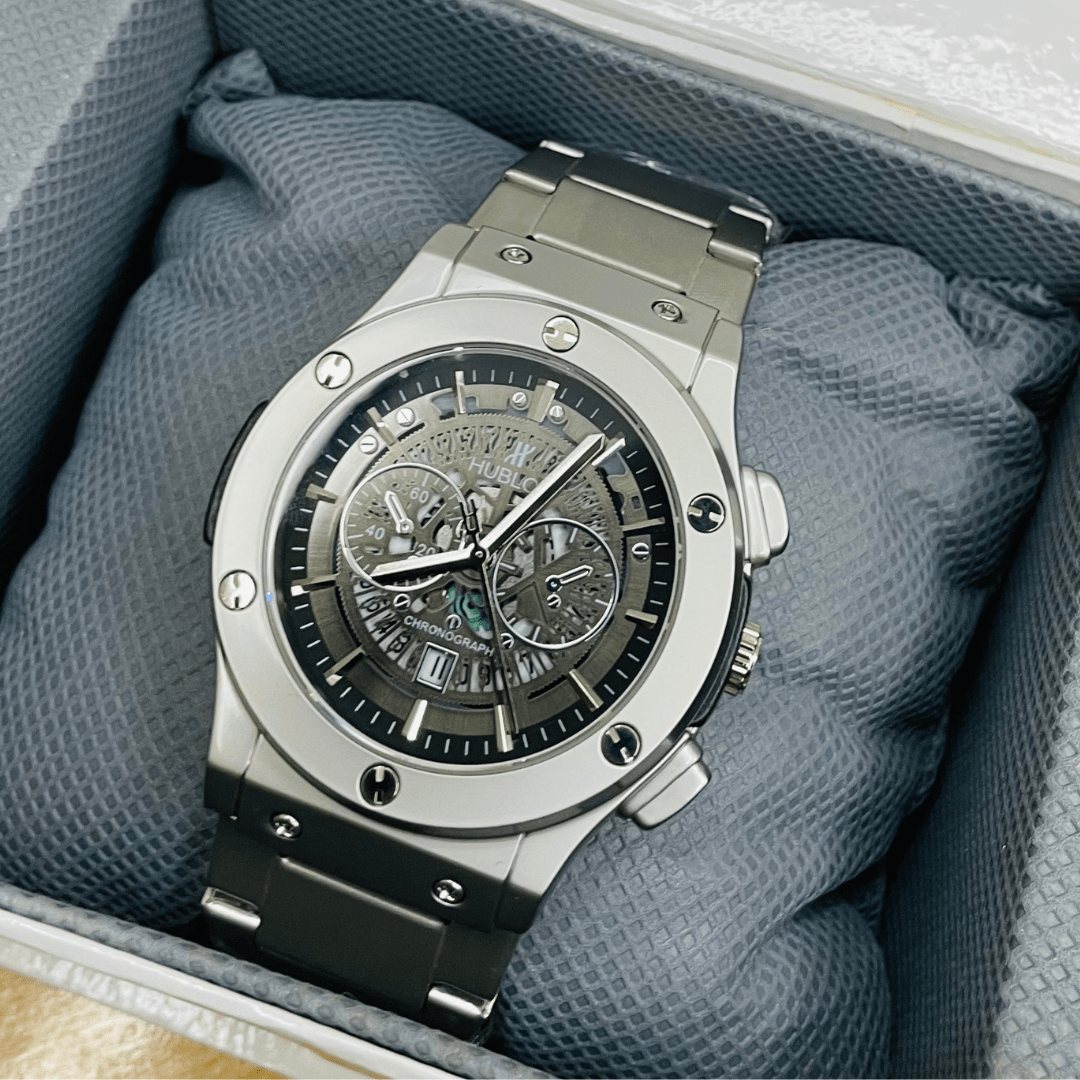 • Showcase your style and precision with the HB Premium Skeleton Watch, featuring a luxury silver matte chain and open mechanical dial. This eye-catching timepiece reveals its inner workings, making it a bold choice for watch enthusiasts and trendsetters.